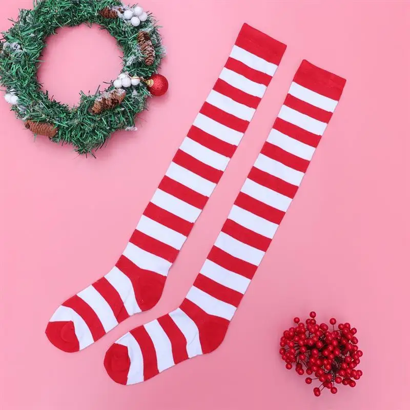 Christmas Red White Stockings Long High Striped Over Knee Socks for Xmas Party Costume Supplies- Free Size