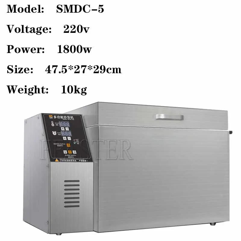 roduct parameter: Name: Multi-function pc version roasting machine Model: SMDC-5 Voltage: 220v Power: 1800w Size: 47*27*29cm Weight: 10kg Product function: roasted whole grains, peanuts, seeds, and different dry goods, coffee beans, dried peppers,etc Model:SMDC-10 Voltage:220v Power:2 Material:Stainless steel Machine size:575*320*375mm Weight:13kg This machine can roste:sesame 2kg/time,soybean:4kg/time,peanut:4kg/time,chestnut:5kg/time Delivery way: 1 you choose "seller&;s transport Method" we can aid you to rearrange the shipment by means of sea and convey in your nearest seaport! - If CFR by way of sea, that means, after arriving destination seaport, the client deserve to pay the destination port prices (such as terminal handling charges, paperwork charges, garage charges, ect), tax to do the customs clearance and decide up the products by yourself 2 you select "By Express " we can enable you to to arrange the shipment through international explicit (such as DHL / TNT/ FEDEX /ARAMEX, ECT) and immediately carry on your deal with (DOOR TO DOOR SERVICE)! If cargo by express, after arriving , the buyer solely need to pay tax and help delivery corporation to do the customs clearance is ok 3 you select " By Air " we can make it easier to to rearrange the shipment via aircraft and carry for your nearest airport! after arriving the airport , the client should pay tax to do the customs clearance and decide up the goods through yourself(cui) please note : 1 If the product is updated, we are able to send the most recent genre The appearance could change, however the parameters and applications stay unchanged 2 If the production technique of mechanical merchandise calls for welding There can be slight welding traces at the welding level This is normal, not a flaw If you mind, please position your order intently or touch the seller to examine the detailed picture three All machine size and weight measured through our hands,maybe have some deviation,please don&;t minds