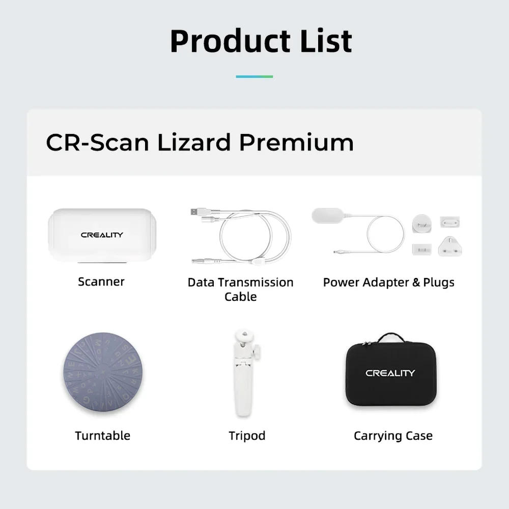Product Name:CR-Scan Lizard Accuracy:0.05mm Resolution:0.1-0.2mm Scan format:500-1500MM Single capture range:200x100mm Working distance:150-400mm Minimum scan:15x15x15mm Scanning speed:10 fps Light source:LED and NIR Outdoor scanning:Support scanning under strong light Tracking mode:Visual tracking Color Scanning:Extended Support Output format:OBJ/STL/PLA System Compatibility:Win 10 64Bit / Mac OS Machine size:155x84x46mm Turntable Mode:Scan 15- 300mm objects Handheld Plus Turntable Mode:Scan 300-500mm objects Handheld Mode:Scan 500-1 500mm objects CR- Scan Lizard is compatible with a portable charger Scope of application:Cultural relics / human body / art / reverse engineering / daily necessities / medical science / animation figures / e-commerce Support Language : Chinese/English/French/German/Japanese/Korean/Portuguese/Spanish