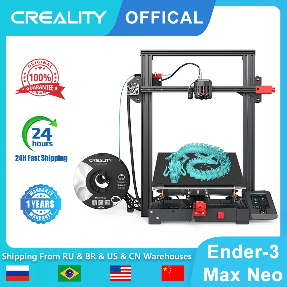 Ender-3 MAX Neo 3D Printer : Bed Temp : up to 110°C Slice Thickness : 0.05-0.4mm Maximum Printing Speed : Maximum 150 mm/s Nozzle Diameter : Standard 0.4mm(Custom Options: 0.3/0.2/0.5/0.6/0.8MM)) Diameter Temp : Standard 0.4mm(Custom Options: 0.3/0.2 /0.5/0.6/0.8/1.00/1.2MM)) Auto Leveling : YES Maximum Print Size : 300*300*320mm Consumables Diameter : 1.75mm Certification : CE Printing Speed : 80mm/s Language : Chinese, English Fliament : PLA, ABS, TPU, Copper, Wood, Carbon Fiber, Gradient Slice Software : Creality Slicer/Cura/Repetier-Host/Simplify3D Power Supply : 350W/24V Precision : +-0.01 Operating System : Creality Slicer/Cura/Repetier-Host/Simplify3D File Format : .stl/.obj / .gcode(after slicing) Molding Technology : FDM Maximum Working Speed : 200mm/s Voltage : 110-220V Gift : 200G Filament / TF Card / Tools ect. Screen : 4.3 Color Knob Screen Automatic Bed Leveling : CR Touch Filament Sensor : Supported Resume Printing : Supported Modeling Technology : FDM Mainboard : 32-bit silent mainboard Data Transmission Method : Type-C USB/SD Card Rated Voltage : 100-120V, 220-240V, 50/60Hz Leveling Mode : Auto-leveling with CR-Touch Quick Assembly : completed within 3 steps Maximize Imagination Larger build volume enables one-time printing for big models or multiple small parts, setting no limit to creative ideas. Stable Printing Dual Z-axes in good coordination with timing belt and motors ensure the stability for quality printing. Hassle-free Leveling Equipped with CR Touch, the print height can be automatically measured and adjusted. Leveling is no longer complicated. Quick Assembly Pre-installation enables the assembly to be completed within 3 steps, reducing the assembly difficulties. Friendly UI With icons added, the 4.3-inch color knob screen is optimized for better understanding. The automatic dimming out function saves energy. Safe to Use The 350W high-quality built-in power supply is more secure and reliable, ensuring stable operation. Smooth Feeding Full-metal Bowden extruder is durable and has greater extrusion force. Assisted by gears, the filament is easy to load and withdraw. Double Protection The resume printing function skillfully copes with the sudden outage, and a filament sensor is equipped to detect the sufficiency of materials.
