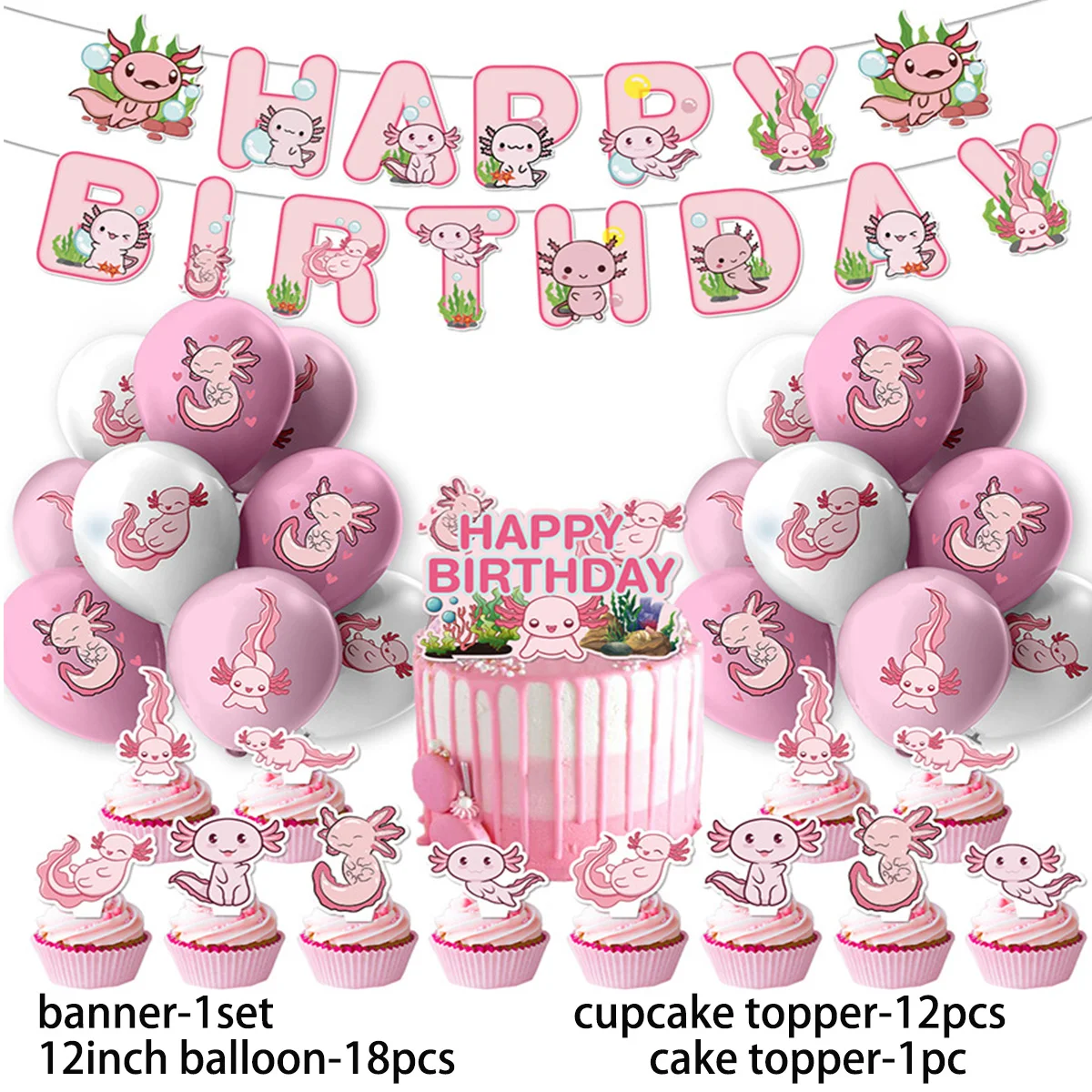 Cute Pink Axolotl Theme Birthday Party Supplies Decor Underwater Animal Balloon Banner Backdrop Cake Topper Kid Baby Shower Gift