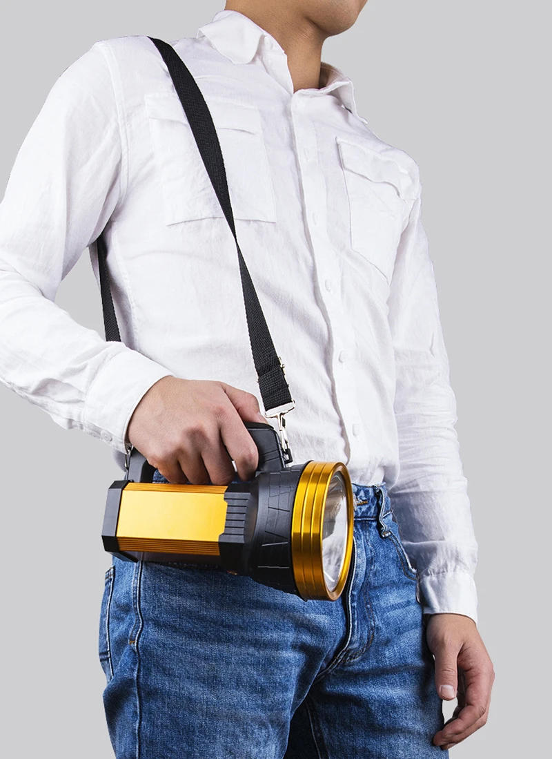 Powerful Spotlight Searchlight Flashlight Large Capacity Lithium Battery Rechargeable Lamp With Power Bank Function Portable Super Bright LED Flashlight Powerful Searchlight Rechargeable Long Range Portable Spotlights With Side Lamp,Power Bank Lamp Product ordinary parameters: Lamp beads: XHP50 Power: 15W Waterproof: IP31 Material: ABS+Aluminum alloy Charging: USB charging Battery capacity: 8000mAh Size: 115*150*206mm Net weight: about 586g Function: USB output / strength show / side mild Input: 5V/1A Package includes: 1 x Searchlight 1 x charging cable 1 x Strap