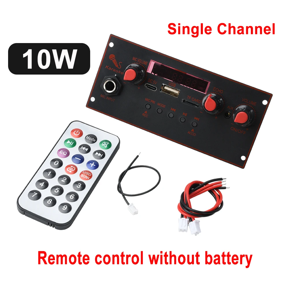 Features: 1 recording function: through the 6 microphone input, with U disk or TF card storage device, easy to attain high-fidelity recording 2 Convenient name mode: Long press the pause button to reply the incoming call, clean to operate and clean voice 3 Power failure memory technology: restart the device after strength failure, it mechanically restores to the last state of use, no use to copy the setup four High-power speaker direct connection: support for single-channel 10W energy output, would be straight connected to the speaker, sound quality surprising and strong 5 Multi-functional incorporated design: set MP3, USB, TF card, LINE IN, FM, BLUETOOTH, 6 microphone and different points Parameter: BT edition five Supply voltage: DC three Current: 1-3A Power: 10W Supported track format: MP3 Product size: 123*56*50mm Package include: Decoder board*1 2P cable*2 Single cable*1 Remote control*1(Without Battery)