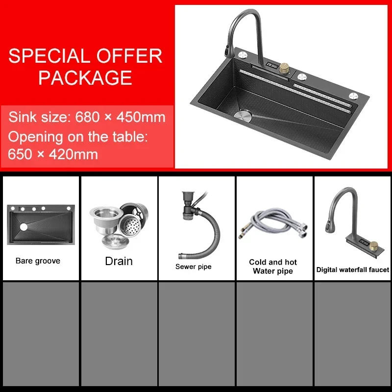 Digital Display Waterfall Sink 304 Stainless Steel Kitchen Sink Embossed Washbasin With Waterfall Faucet For Kitchen Renovation