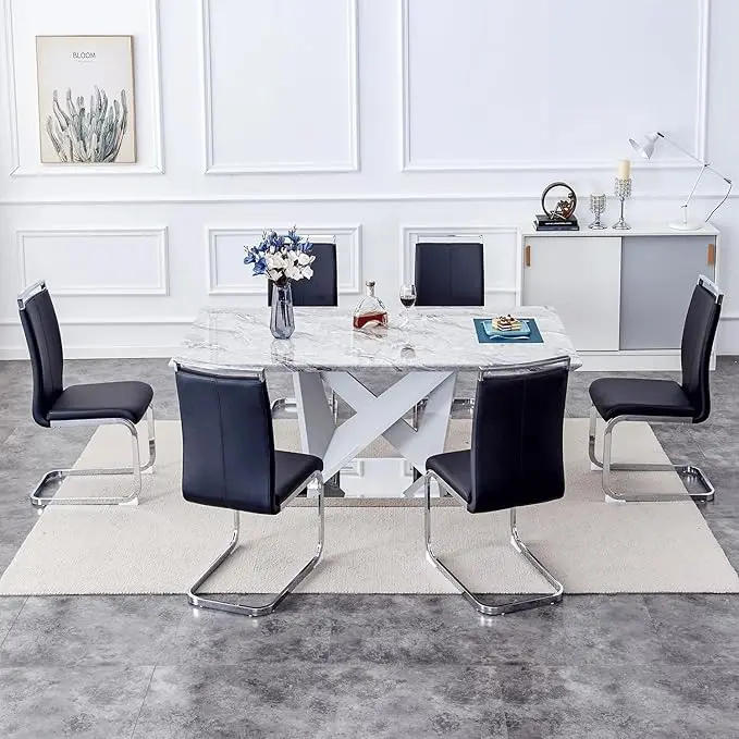 About this item 【Dining Room Table Set for 6】:This contemporary eating set contains a grey oblong marble table and six chrome-plated metal chairs, exuding a elegant design with a hint of unfashionable charm, raising the sophistication of your dining discipline 【Sturdy and Durable Faux Marble Dining Table】: This grey eating table features a 1 thick MDF tabletop lined in a modern marble pattern with thick grey modern legs Balancing beauty and durability 【Metal Chrome Dining Chair】:Modern eating chair made of high-quality PU fabric, water-resistant and breathable, full of high-density sponge inside, soft and comfortable sitting can efficiently relieve fatigue to last, the durable C-shaped chrome-plated metal bracket presents physically powerful balance and can easily help up to three hundred pounds 【Easy to Assembly】:Instructions and instruments are integrated within the package, enjoy clean installation of your eating desk set This desk is optimal for a variety of environments from dining room, kitchen, bistro and more 【After-Sales Service】:Purchase and use of quite a lot of disorders in the activity would be contacted through mail, and inside 12 hours to reply and enable you to solve, to deliver you a worry-free searching ride