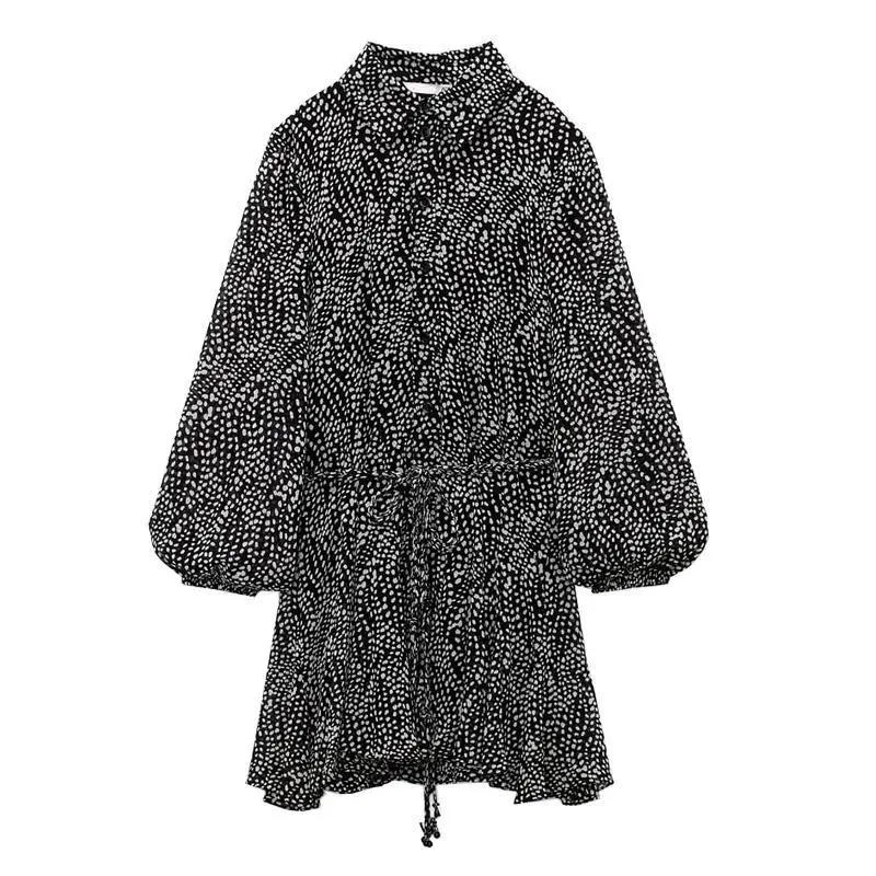 Dot Printed Lace-up Mini Dress 2024 Spring Casual Chic Long Sleeve Lapel Collar Shirt Dresses Women Elegant Fashion Vestidos