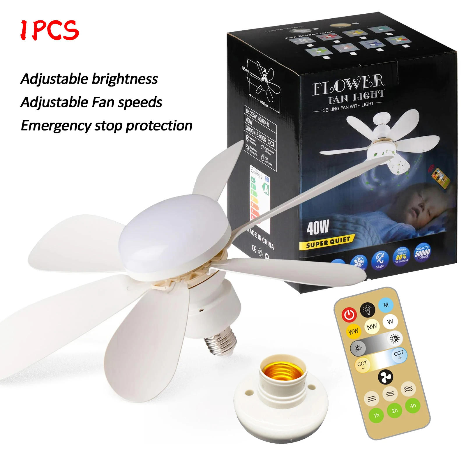 E27 Lamp Holder 40W LED Ceiling Fan Light Remote Control Dimming 85-265V Portable Easy installation for Household Use