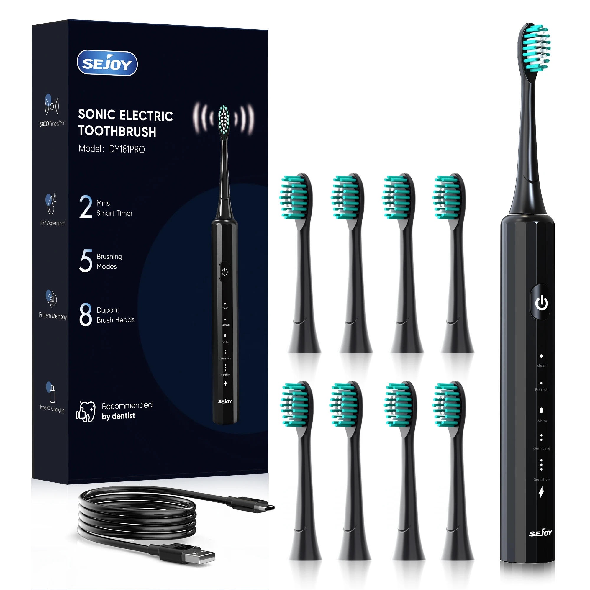 SEJOY Electric Toothbrush With 8PCS Description:Rated voltage: DC 5VWaterproof rating: IPX-7Working mode: 2 minutes timerNet weight: about 0 frequency: 30000-33000 times/minute 5 Brushing ModesRechargeable electric toothbrush has five brushing modes, that might meet all of the purposes of teeth cleaning: Cleaning,refresh, whitening,gum care,sensitive 33000VPM High VibrationElectric toothbrush is provided with a super-powered motor, which can generate 33000 VPM/Min sound wave vibration, enamel can be thoroughly cleaned, and help prevent tooth decay and upgrade gum health. IPX7 WaterproofThis electrical toothbrush affords IPX7 water resistant rating, and the complete toothbrush could be rinsed with water. You can safely use the toothbrush within the tub or shower. 2 Min Smart Timer2 min auto shut off:Dental specialists recommend a 2-minute brushing time to forestall excessive cleaning time. Interval pause in step with 30 Sec: remind replacing brushing field to guarantee enamel are cleaned. Fast Charging3 hours prompt charging and final over 120 days