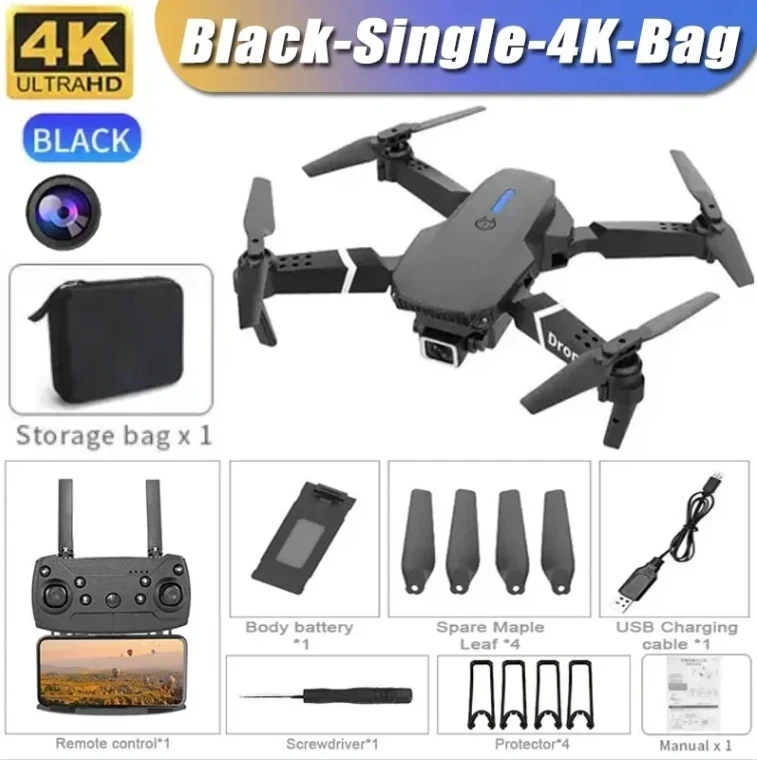 Descrição Novo E88Pro RC Drone 4K Professinal Com 1080P Grande Angular Câmera HD Dobrável RC Helicóptero WIFI FPV Altura Hold Presente Brinquedo Descrição do produto: - Item NÃO : E88 Pro - Freqüência: 2 - Canal: 4CH - Motor: 816 Coreless Motor - Bateria do Quadricóptero: 3 1800mAh Lipo (Incluída) - Bateria do transmissor: 3x1 AA bateria (não incluída) - Tempo do voo: 10 minutos - Carregando o tempo: a hundred minutos - R/C Distância: 100m - Cor: Preto Branco - Câmera: 1080P / 4K (opcional) - Tamanho do quadrilátero: 25*20*5 CM (os braços não dobrados,) - 12*8*5 CM (os braços dobrados) - Características: - Com braços dobráveis, tamanho pequeno, fácil de transportar - Com a função do modo espera altitude fornece voo estável - Com função wifi pode ser conectado APP, sistema APK para tirar fotos, vídeo, transmissão em tempo genuine através da imagem da câmera do telefone - Há 2 câmeras pode ser escolher Com 1080P ou 4K câmera grande angular dar grandes imagens denfinition alta e vídeo - Com o modo Headless, não há necessidade de ajustar a posição da aeronave antes do voo - Com uma tecla para retornar a função torna fácil encontrar o caminho de casa - Voo de trajetória Desenhe uma maneira de voar na tela, e o drone conduziria um vôo autônomo ao longo do caminho designado - 2 Tecnologia Adotada para Anti-Interferência - 4 Canal que pode ascender, descer, avançar, retroceder, voar para a esquerda, voar para a direita e rolar 360 ° - 6-a-xis g-yro que pode ter voo mais estável e ser fácil de controlar - Tem three níveis de velocidade de voo para alternar que pode fazer mais divertido com o voo - -A fuselagem do quadcopter é feita de plásticos de engenharia de alta resistência e resistentes, resistência leve e durável - Funções: - Cima/baixo, Frente/trás - Vire a esquerda/direita voo Sideward - Velocidade de voo de three níveis - Luz de LED - Modo sem cabeça - Um retorno automático chave - Modo Altitude Hold - WiFi FPV/Trajetória Voo - Câmera/Vídeo - Pacote incluído: 1 x Quadrotor E88 RC - 1 x transmissor - 1x3 1800mAh Lipo Battery (pode ser escolher a quantidade da bateria quando a ordem) - 1 x cabo carregamento USB - four x lâminas sobressalentes -