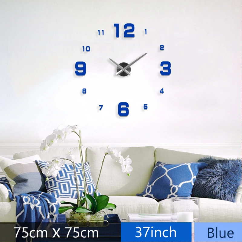 Fashion 3D Mediterranean style big size blue wall clock mirror sticker DIY brief living room decor meetting room wall clock