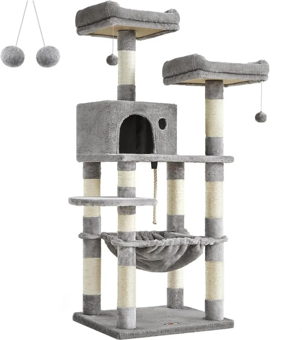 FEANDREA Cat Tree, Cat Tower for Indoor Cats, 56.3-Inch Cat Condo with Scratching Posts, Hammock, Plush Perch,Light Gray UPCT15W