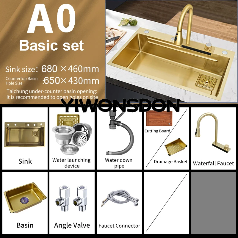 Description Buyer&;s attention 1 Due to handbook measurement, please discuss with the particular product Due to screen differences, the colour could also be slightly various from what you expect, please enable Product information Product name: Multifunctional kitchen sink Product material: chrome steel Product size: 68x45cm 75x45cm, 80x45cm Product color: Golden Sink Style: Single bowl Product thickness: 3mm Product features 1: Waterfall Faucet Design 2: Step sink design 3: Nano chrome steel material 4: Wear resistance 5: Easy to wash 6: High temperature resistance 7: Increase skill 8: Three installation methods: Apron Front /Above Counter /Semi-inserted undercounter basin