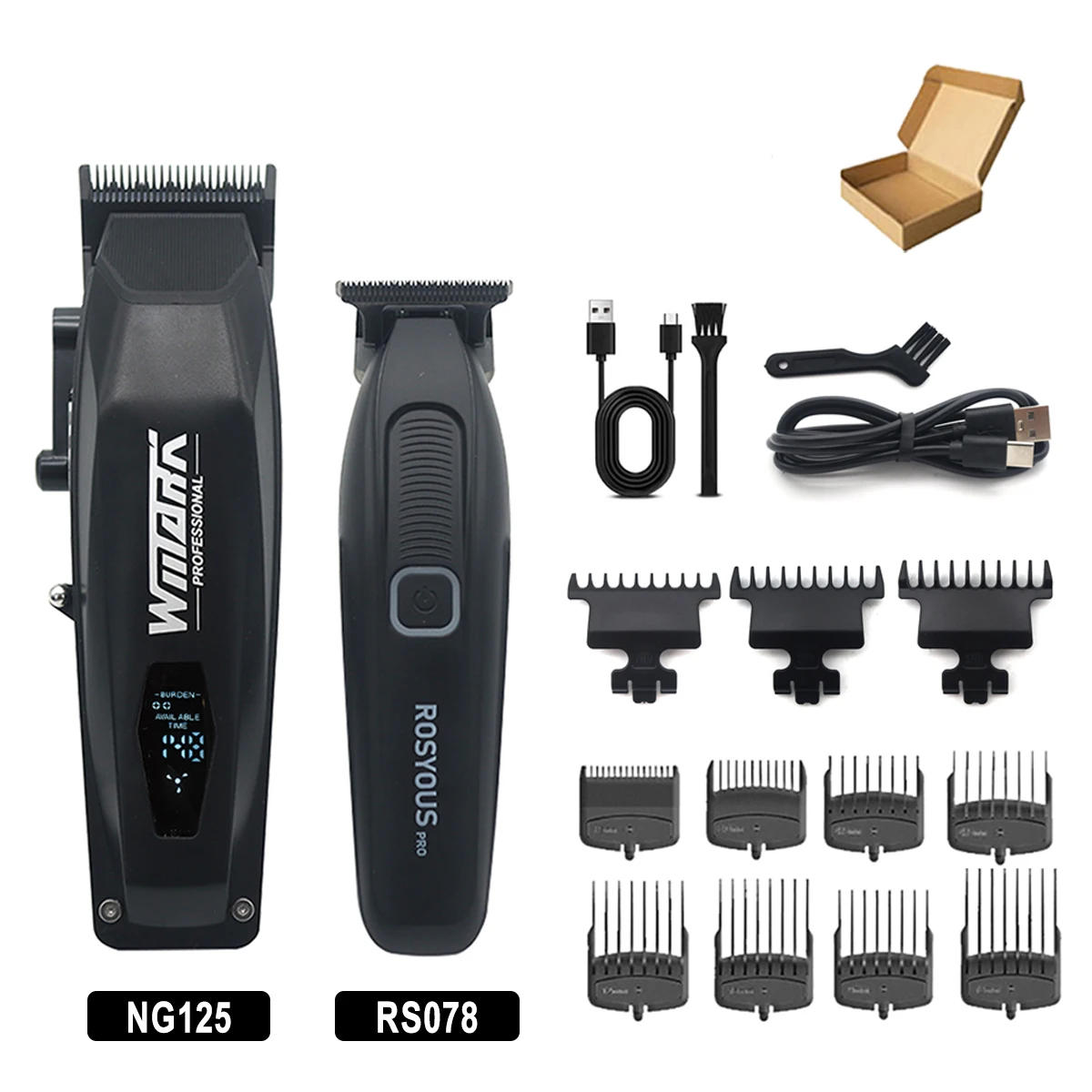 About Shipping Time:7-20 Days Specification Model: NG-125 Power: 5W Power supply mode: USB charging cable Battery capacity: 2000mAh Charging time: 3 hours Working time: 150min Model:RSOYOUS-RS078 Speed:7300RPM Power:5W Battery Capacity:1500mhA Charging time:2Hours Usage time:240Minutes Moving blade material:Carbon Steel Blade process:DLC Model: NG-7982 Speed: 9000RPM Battery capacity: 1400mAh Charging time: 2Hours Usage time: 200Minutes Blade material: Steel Features DLC Blade Technology – Features a nice DLC (Diamond-Like Carbon) coated blade for ultra-sharp, long-lasting reducing performance, making certain soft and precise haircuts whenever 9000RPM High-Speed Motor – Powered by a strong motor with 9000 rotations in line with minute, handing over effective and strong chopping for professional-grade results Cordless Freedom (if applicable) – Wireless design allows for unrestricted movement, perfect for barbershop and home use This Professional Hair Clipper Kit is perfect for barbers, stylists, and residential customers seeking salon-quality functionality with stepped forward facets Package checklist NG-125 1 * Hair Clipper eight *Limit Comb(1, 3mm, 4, 6mm, 10mm, 12mm, 15mm, 18mm) 1 * USB Charging Cable 1 * Cleaning Brush RS-078 Machine*1Machine*1 Charging Cable*1 Cleaning Brush*1 Limited Comb:1/2/3mm NG-7982 1 * Machine 2 * Extra Blade 1 * Extra NetCover 1 * USB Charging Cable 1 * Cleaning Brush Note: Due to the limitation of air transport, this product does not contain oil,Please perceive