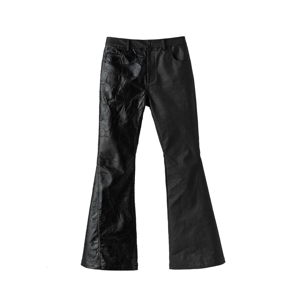 Hand Coated slim-fit Wax Top Splicing Black PU Leather Pants