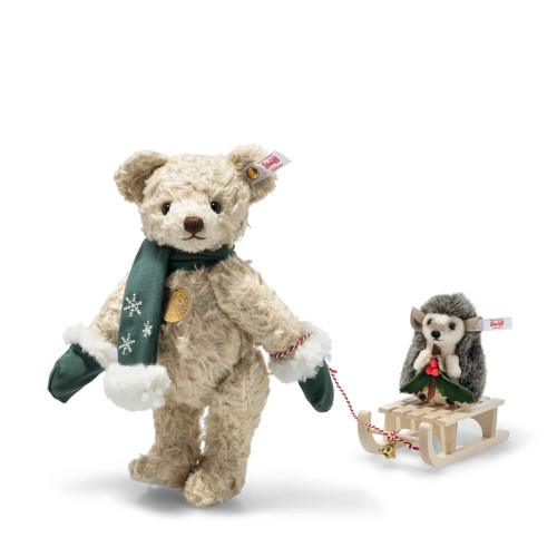 This adorable light brown Steiff Teddy bear is lending a helping hand to the little hedgehog he pulls behind him on a wooden sleigh. The 4 inch hedgehog carries some decorative holly made of felt in his little paws, which matches his Teddy bear friend's gloves and scarf. Both are made of eco-friendly, sustainable materials such as linen, organic cotton, and plush. The perfect Christmas gift for the perfect friend! Product Details: Collection: 2022 Worldwide Limited Edition - "Teddies for Tomorrow" Edition Size: 2,020 pieces worldwide Material: Teddy bear made of linen plush; scarf and gloves made of organic cotton; hedgehog made of plush and organic cotton Color: Multicolored Size: Teddy Bear 10 inches & 5-way jointed; Hedgehog 4 inches Eyes: Safety eyes Ear Tag: With “Teddies for Tomorrow” brass medallion and gold-plated “Button-in-Ear” Care: Surface washable Country of Origin: Made in Germany Age Group: Adult Collectors. NOT A TOY