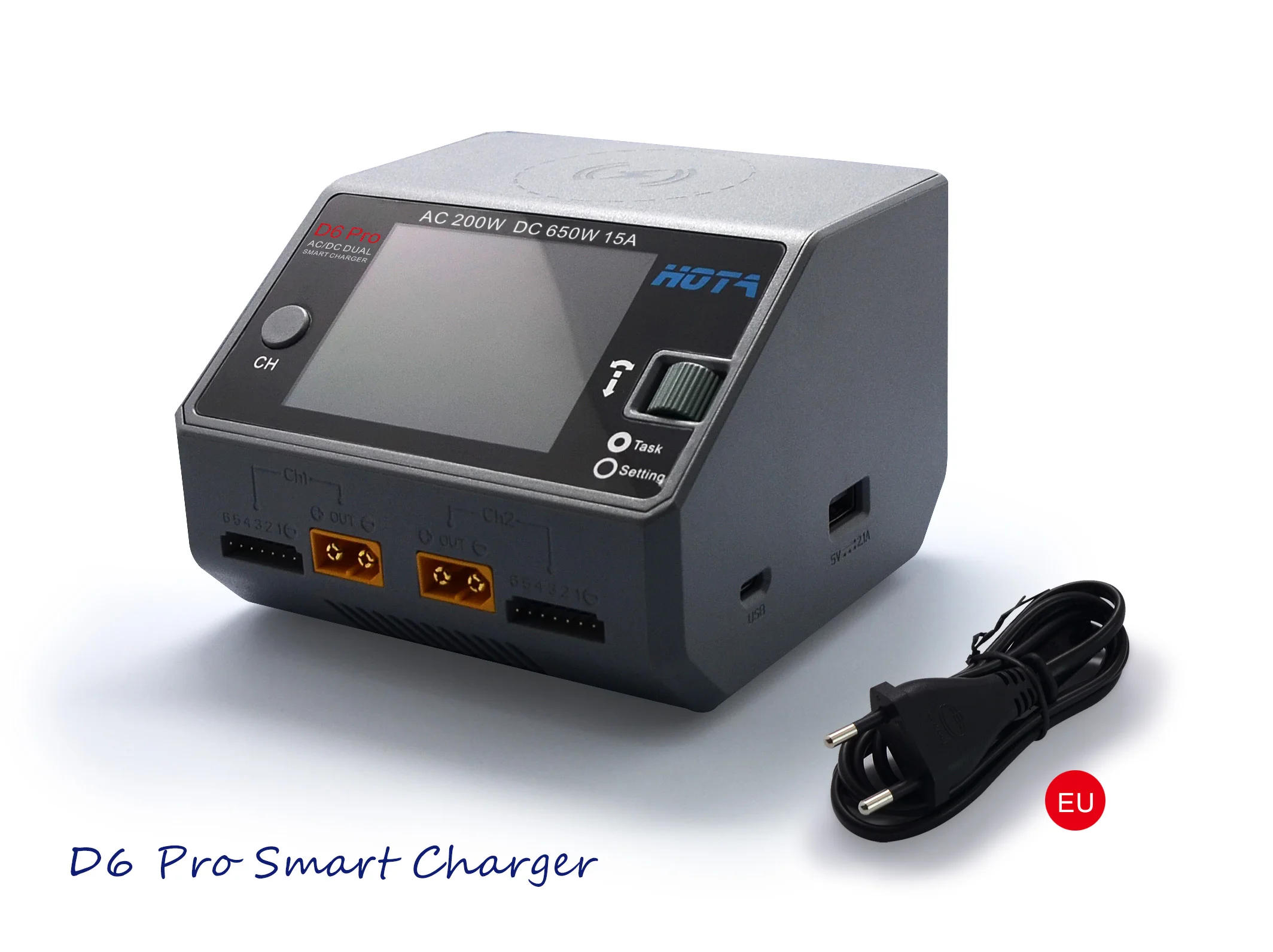 Specification: Brand: Hota Model NO: D6 Pro Input Voltage: AC100~240V / DC 6~30V Charge Current: 0~15A * 2 Charge Power: DC 325W * 2(650W) AC 200W(Support strength distribution) Discharge Power: Internal discharge:15W * 2(balance port 10W) External discharge:325W * 2 Battery Type: LiHv/LiPo/LiFe/Lilon/Lixx : 1~6S NiZn/Nicd/NiMH : 1~16S Smart Battery : 1~6S Lead Acid(Pb) : 2~24V Enelop : 1~16S Balance Current: 1600mA * 2 Discharge Current: 0~3A * 2 External Discharge Current: 1~15A * 2 USB Output: 5V / 2 Dimensions: 108×105 ×76mm Net Weight: 555g Package Information: Package size: 11 * eleven * 10 / 4 * four * four Package weight: 690g Gift box kit Package List: 1 * D6 Charger 1 * Charger Plug 1 * Manual