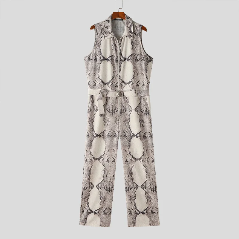 INCERUN Men Jumpsuits Printing Lapel Sleeveless Zipper Casual Male Rompers Streetwear 2024 Fashion Men Overalls With Belt S-5XL