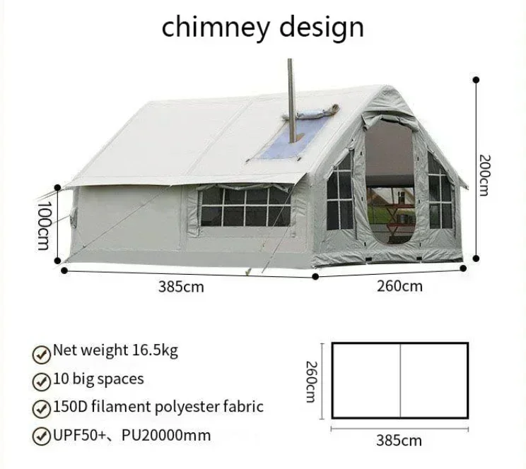 Inflatable 10 square meters camping tent 6-8 person space chimney design windproof and rainproof no need to build