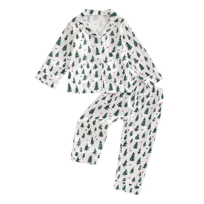 Kid Girl Boy Christmas Pajama Set Reindeer Print Long Sleeve Button Down Tops Elastic Waist Pants 2 Piece Set