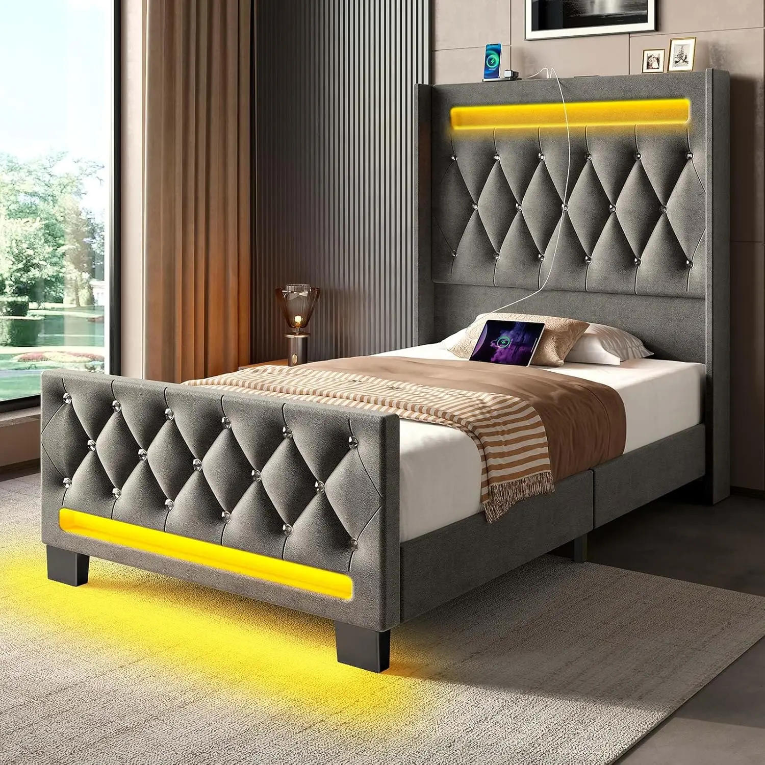About this merchandise Versatile RGB LED Light: The RGB LED light adds atmosphere to your bedroom, with 12 scene modes, 7 static colors, five dynamic colors, three pace modes, and three brightness modes to make a choice from With assorted color suggestions and lighting fixtures effects, you may easily set the perfect mood for relaxation or entertainment Convenient Charging Station: bed frame is provided with a integrated charging station, adding 2 USB and 1 Type-C port, allowing you to conveniently payment your electronic instruments appropriate from your mattress No extra searching for retailers or utilizing extension cords Enhance Your Bedroom Style: This luxurious bed body facets an upholstered velvet design with a excessive headboard and high footboard, adding a touch of sophistication, making a point of interest within the room Comfortable and Quiet Sleeping Experience: Crafted with durability in mind It points heavy-duty wooden slats that supply perfect help on your mattress, no need for a box spring This design ensures a noise-free sleep experience, permitting you to relaxation peacefully throughout the evening Easy to Assemble: The design of our product is often committed to creating a convenient and easy set up route for customers With detailed directions and all mandatory hardware included, you possibly can soon establish your new mattress frame with none trouble Spend less time assembling furnishings and more time enjoying your exquisite bedroom
