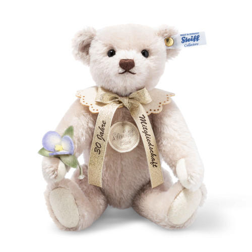 The Loyalty Teddy bear for a 30-year Club membership is made of the finest pale blond mohair and stands 9 inches tall. The felt collar, chest tag, and little hat are made of a cheerful yellow felt, while the golden colored glitter bow celebrates the long Club membership. Product Details: Material: Made of the finest mohair Size: 9 inches Color: Light gray Joints: 5-way jointed Eyes: With safety eyes Ear Tag: With brass "Button in Ear" Care: Surface washable Warning: This product is not a toy. It is intended for adult collectors only.