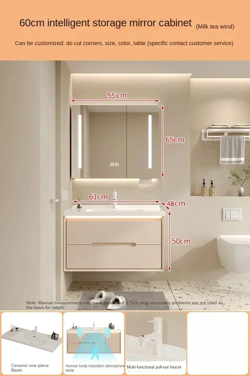 Function: Storage, lighting, anti fogging Cabinet material: strong wooden multi-layer Surface technology: paint free Table Type: Integrated Ceramic Basin