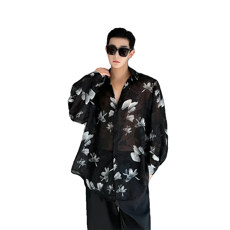Men See Through Lightweight Loose Casual Vintage Print Long Sleeve Party Dress Shirts Beach Blouses Man Performance Costumes