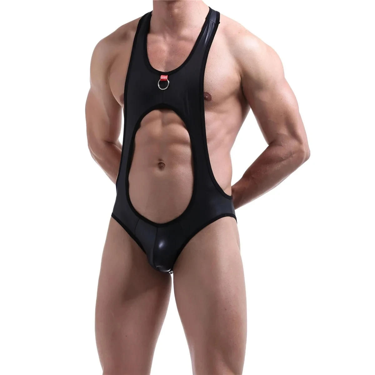 Mens Undershirts Lingerie Jock Strap PU Leather Open Back Bodysuits Gay Latex Catsuit One Piece Wrestling Singlets Jumpsuits