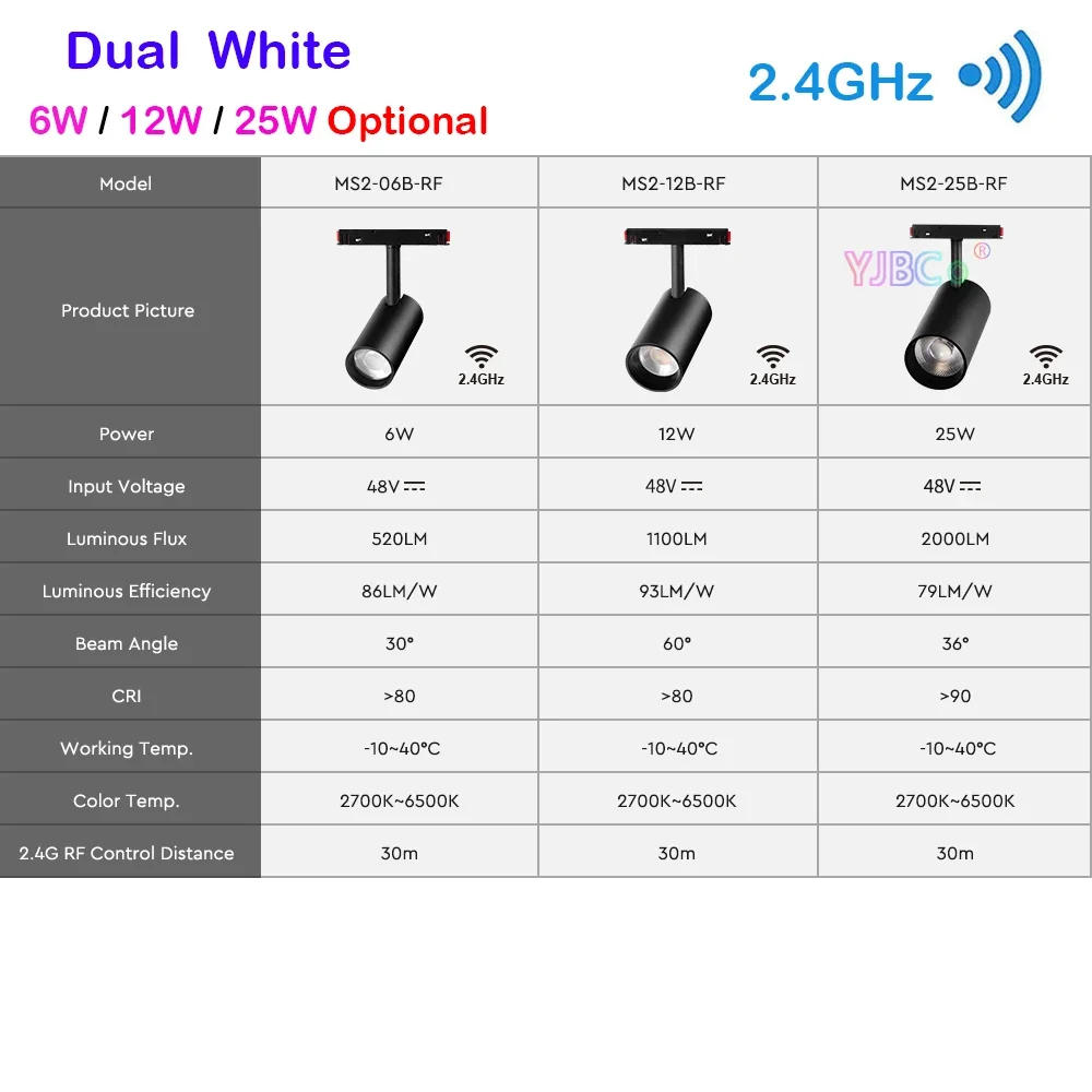 Product Parameters : Product Name: RGB+CCT Magnetic Spotlight(2) Model No.: MS5-06B-RF (6W RGB+CCT ) MS5-12B-RF (12W RGB+CCT) MS5-25B-RF (25W RGB+CCT) Power : 6W / 12W / 25W (Optional) Input Voltage: 48V⎓ Luminous Flux: 420LM (6W) / 1000LM (12W) / 1800LM (25W) Luminous Efficiency: 72LM/W (6W) / 82LM/W (12W) / 75LM/W(25W) Beam Angle: 30° (6W)/ 60°(12W) / 36°(25W) CRI: >80 (6W) / >80(12W) / >90(25W) Working Temperature: -10-40°C Color Temperature: 2700K~6500K 2 RF Control Distance : 30m Description: • Powered through rail, stable magnetism • Compatible with Mi-Light / MiBoxer 2 sequence distant • Control Distance: 30m • 16 Millions of colors to make your mind up • Brightness and shade temperature adjustable Product Name: Dual White Magnetic Spotlight(2) Model No.: MS2-06B-RF (6W Dual White ) MS2-12B-RF (12W Dual White) MS2-25B-RF (25W Dual White) Power: 6W / 12W / 25W (Optional) Input Voltage: 48V⎓ Luminous Flux: 520LM (6W)/ 1100LM (12W)/ 2000LM (25W) Luminous Efficiency: 86LM/W (6W) / 93LM/W (12W) / 79LM/W(25W) Beam Angle: 30° (6W)/ 60°(12W) / 36°(25W) CRI: >80 (6W) / >80(12W) / >90(25W) Working Temperature: -10-40°C Color Temperature: 2700K~6500K 2 RF Control Distance : 30m Description: • Powered by means of approach of rail, stable magnetism • Compatible with Mi-Light / MiBoxer 2 series remote • Control Distance: 30m • Color temperature and brightness adjustable Package including: 1 piece* 6W / 12W / 25W RGB+CCT/Dual White Magnetic Spotlight (2) (As you choose)