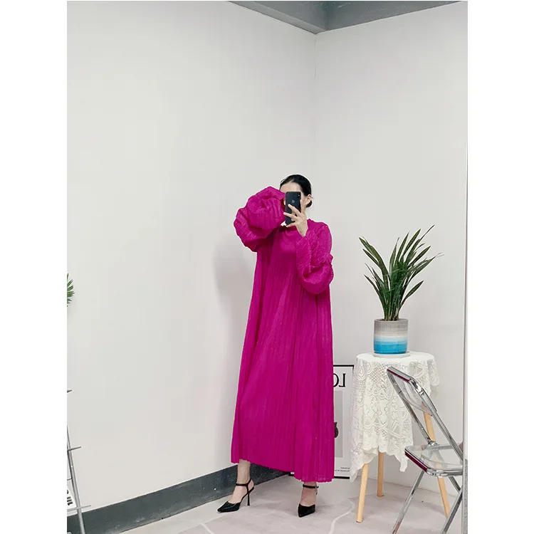 Miyake Pleated Puff Sleeve Long Dress Women 2023 New Fashion Korean High Neck Causal Elegant Loose Plus Size Dress