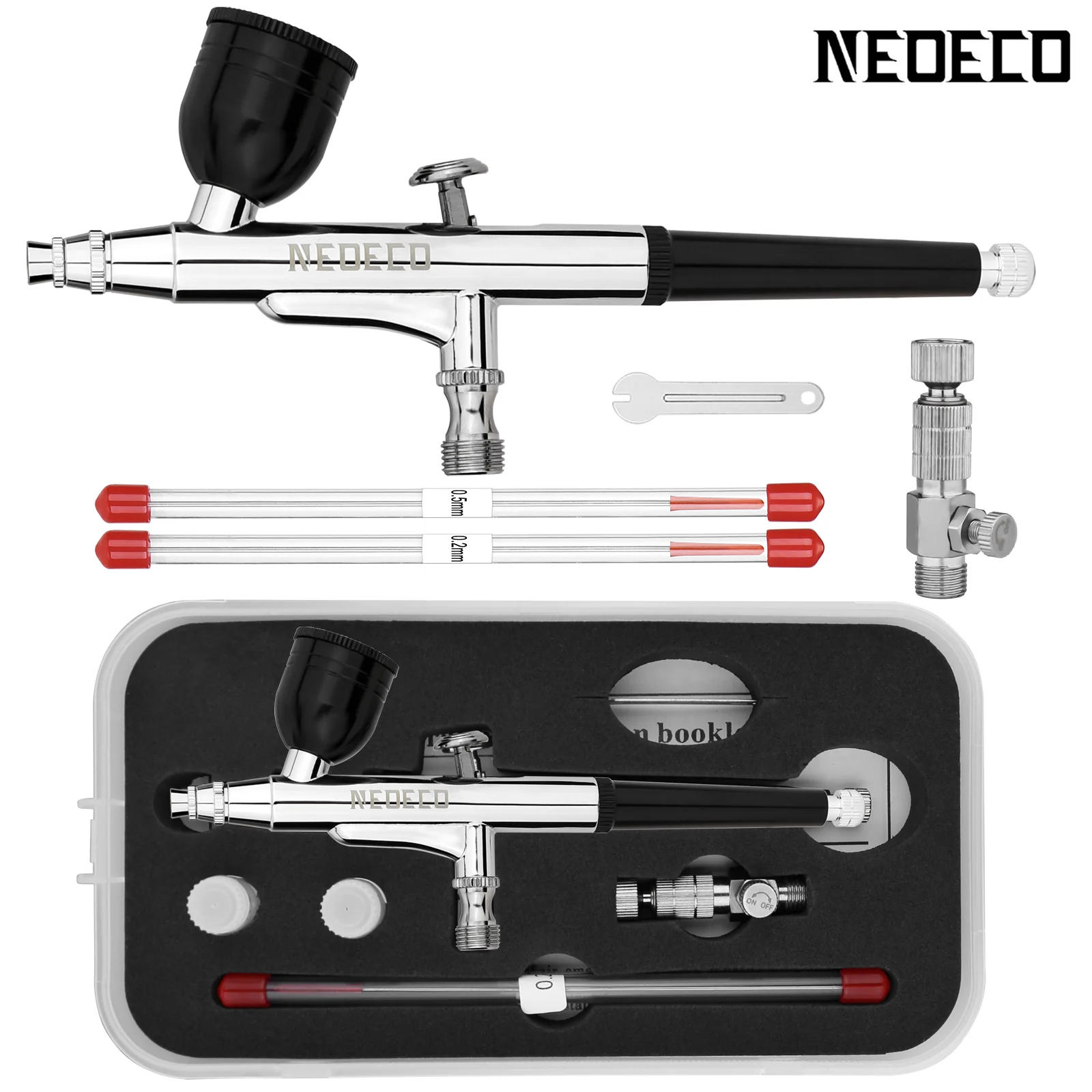 NEOECO 130 Gravity Feed Dual Action Airbrush with 0.2 0.3 0.5mm Nozzle Needle kit Adjustable Quick disconnect Joint Red Black The gravity feed dual-action airbrush is perfect for commercial arts, illustrations, photo retouching, crafts and many other hobbies, such as drawing, painting, cake decorating, cosmetics, nail art, tanning, temporary tattos and so on. Features: Multi-purpose high performance gravity feed dual-action airbrush. Dual-action trigger air control. Nozzle: 0.3mm; Gravity Feed: 7CC fluid cup with lid. Easy fluid refills and easy cleaning. Durable stainless steel. Removable back handle cover for adjusting the thin spraying line. The spray pattern is in accordance with the distance between the work surface and the airbrush. Applications: commercial arts, illustrations, custom automotive, cake decorating, cosmetics, temporary tattoos, crafts and many other hobbies Color Media: Watercolors, acrylics, inks & dyes, automotive urethanes, lacquers, enamels. Includes 1pc nozzle spanner, 1pc 2cc Dropper for easy fluid refills Specifications: Material: Stainless steel Feeding Method: Gravity feed Nozzle Diameter: 0.3mm Fluid Cup Capacity: 7CC Hose Connector: 1/8" with removable cover Working Pressure: 15-50PSI Item Size: 14.4 * 7.8 * 1.1cm / 5.7 * 3.1 * 0.43in(L * H * Dia.) Item Weight: 96g / 3.4oz Package Size: 18.6 * 10.7 * 3.6cm / 7.3 * 4.2 * 1.4in Package Weight: 236g / 8.3oz