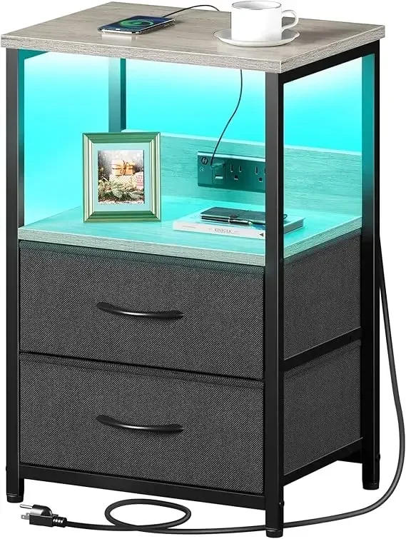 Nightstand with Charging Station, Bedside table with LED Lights, Night stand Fabric Drawers, Storage End Table for Bedroom