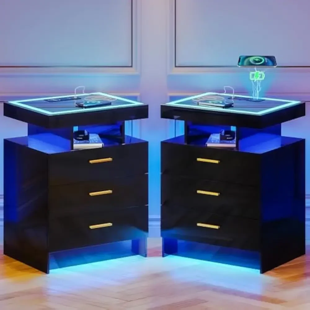 Nightstands with Wireless Charging Station, Auto Sensor 3 Color Dimmable LED Night Stand, Bedside Table with 3 Drawers