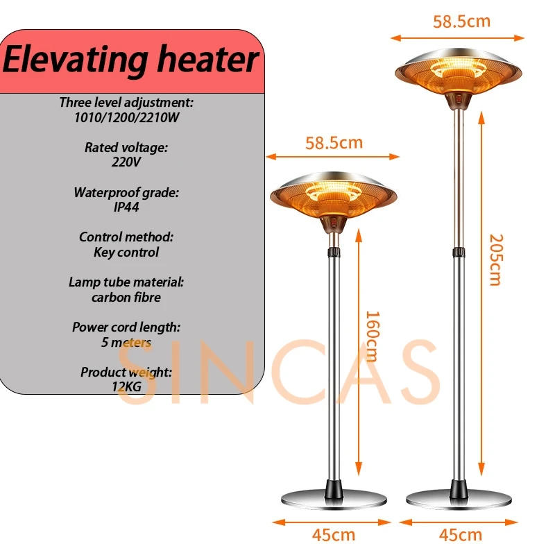 Outdoor Umbrella Shaped Electric Heater Stainless Steel Waterproof Outdoor Terrace Garden Electric Heater 2200W Electric Heater Rated power: 2200 Heating method: halogen tube heating Operation method: mechanical Rated voltage: 220 Type of heating appliance: electrical heater Air delivery method: no turning and no shaking Applicable area: 30㎡ and above Shell process: laser engraving Safety protection: power off when tipping over Noise: 36-45dB (inclusive) Wind speed gear: 3 gears