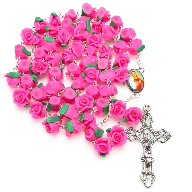 Q1JB Soft Pottery Rosary Necklace Holy Catholic Jewelry Charm Crafts for Christian Church Home Bedroom Decorations