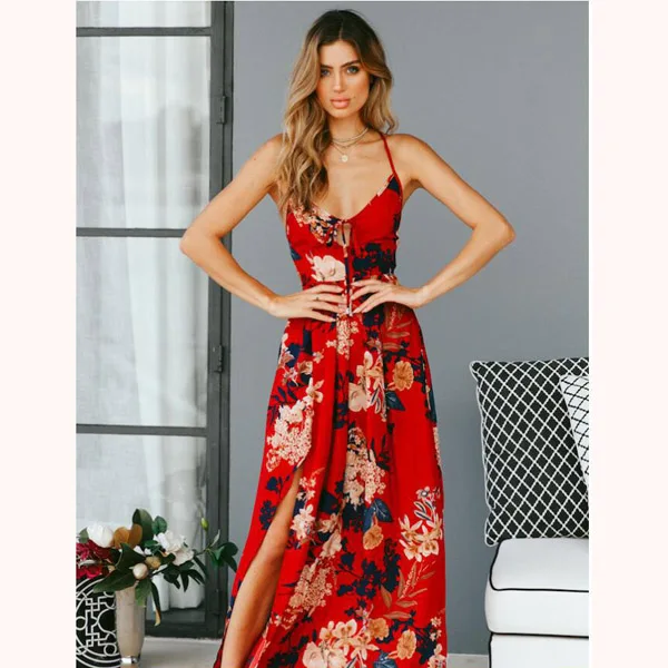Red Backless Floral Maxi Dress Summer Women Sexy Party Spaghetti Strap Sundress Boho Beach High Weist Chiffon Dress Vestidos