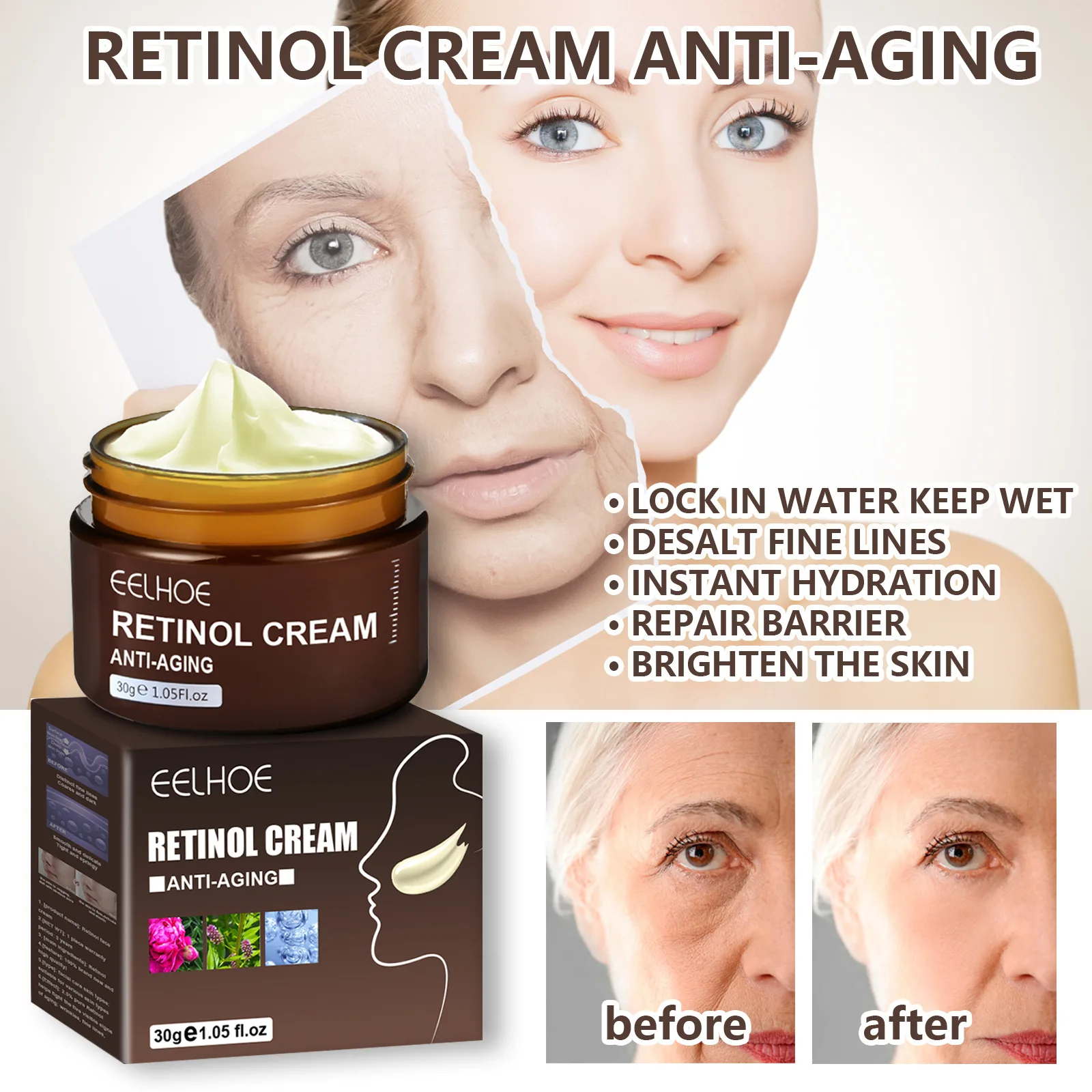 Featrure: ▶[Vitamin A (retinol) is generally recognized by the academic community as the golden key to anti-aging, effectively stimulating collagen production, helping to reduce fine lines and improving skin roughness. Description: 1.[Product name]:Retinol Face Cream 2.[NET WT]: 30g 3.[Main ingredients]:2.5% Retinol &Vitamin C &Vitamin E 4.[Feature]:Anti-Aging 5.[Type]:Tightening Revitalizing Face Cream 6.[Effect]: Tightening Revitalizing Fine Lines Moisturizing 7.[Benefits]:Anti Aging,Dark spots/ Hyperpigmentation,Dullness/Uneven texture,Fineline/ Wrinkles,Uneven skin tone 8.[Advantage]:Whitening Brightening Moisturizing Anti-wrinkles 9.[Skin Type]:All Skin Type,Ageing,Dry,Normol,Sensitive 10.[Expiration Date]:36 Months 11.[Details]:Retinol Face Cream Tighten face skin, fade fine linesPackaged in Single Package Package Include: 1Pcs