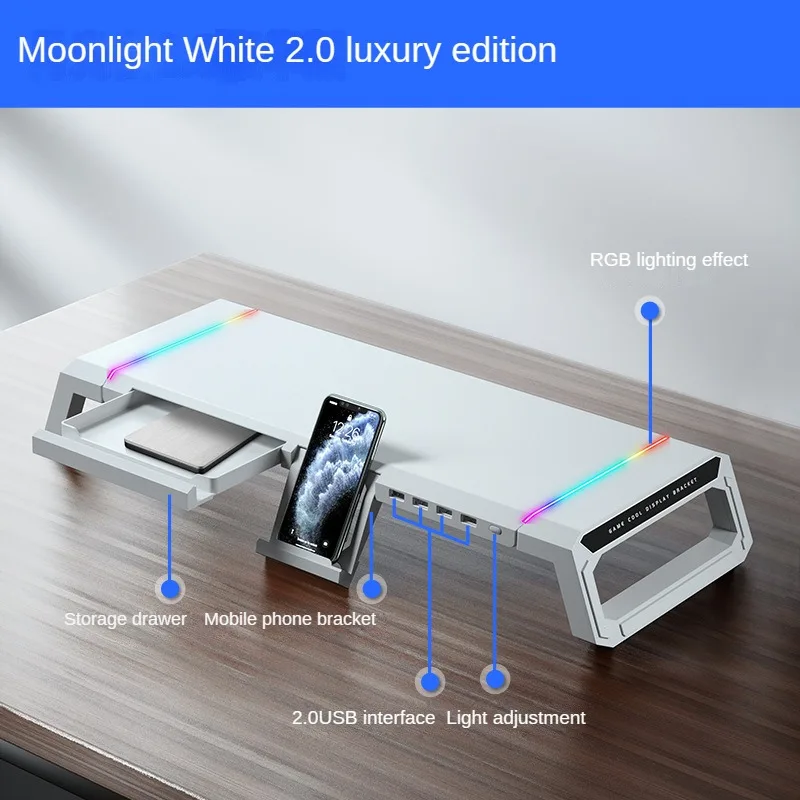Dear Friend: Welcome to MING NUOHOME STORE, we will provide you with high quality products and services.If you are satisfied with our products and services, please give us a positive feedback. If you have any questions, please feel free to contact us. RGB T1 Computer Monitor Stand Raiser Aperfect desk organizer as well as great space saver. Folding size: 41 * 20* 7.5cm Unfolded size: 55 * 20 * 7.5cm Material: ABS 【4 USB interface & RGB Lights】The computer stand for desktop monitor has 4 USB 2.0/3.0 ports,transfer speed fast.The RGB lights on both sides of the computer screen stand for desk can switch between 9 lighting effects by pressing the button. 【Ergonomic Monitor Stand Riser】 Keep your monitor at comfortable eye level to effectively prevent your back and neck strain when you work in front of a computer,contributing to improve your daily working productivity. And additional space underneath the stand allows you to store keyboard and mouse compactly when not in use. 【Foldable Stand Wide】This monitor stand riser is adjustable and 3 kinds of width-55cm/21.7 inch, 41cm/16.1 inch and 20cm/7.9 inch. You can adjust it's width as you want, suitable for different monitors, and when you want to elevate the monitor height. 【Multi-functional design】Built-in 1 phone holder and 1 small storage drawer for easy storage, come in hand when you need to use your phone and pen immediately.Enjoy a clean workstation! 【Sturdy & Stable】This monitor stand riser consists of an ABS platform and metal hinges, it can easily hold up to 30kg computer monitor, laptop, printer, etc.