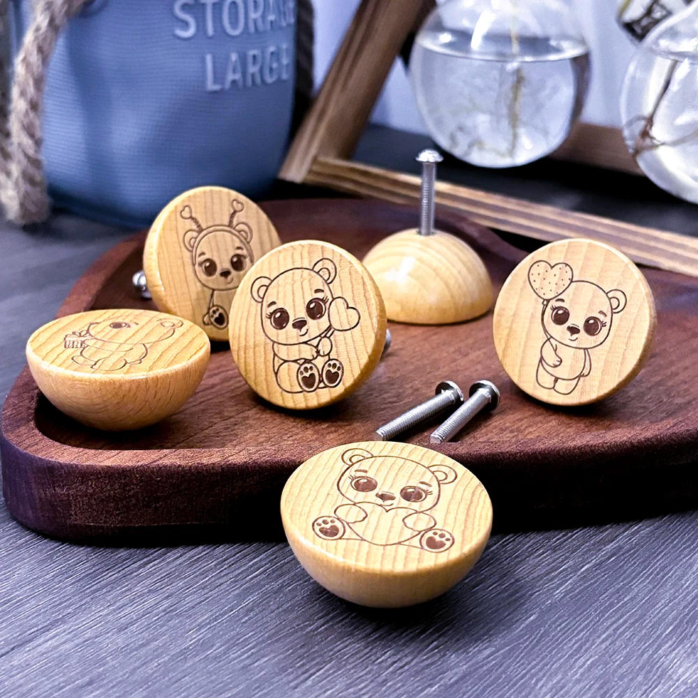 Set of 6 Handmade Beech Wood Knobs with Engraved Cute Bear Pattern for Kitchen Cabinets Pulls Dresser Drawers Knobs