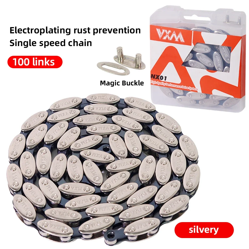 Parameters Brand: VXM Product name: Olive chain Material: High carbon metal Color: Silver/dazzling coloration Number of knots: 100 knots Size: 1/2"X 1/8" Weight: 389g Speed: unmarried velocity Application: Single-speed bicycle/dead fly bicycle