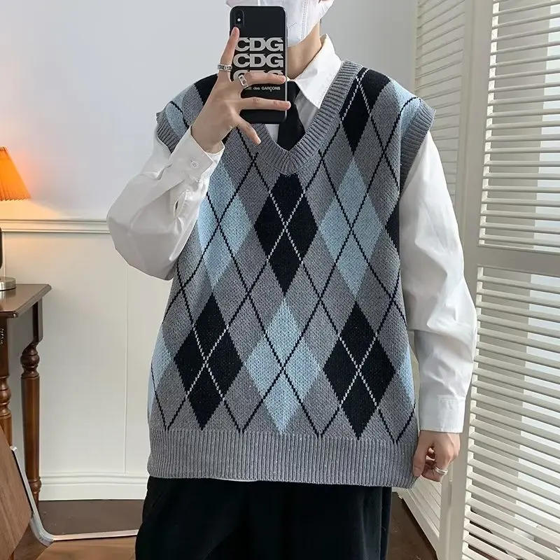 Sweater Vest Men Argyle Spring New Arrival Korean Style Trendy College V-neck Loose Knitting Handsome Harajuku Ropa Para Hombre