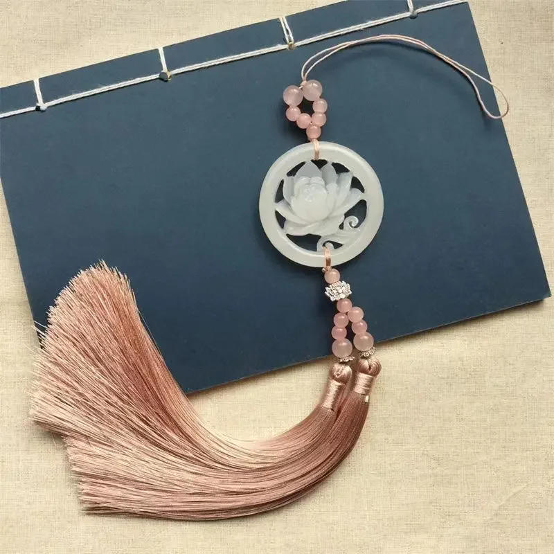 Tassel Handmade White Jade Hollow Lotus Jade Pendant Key Tassels Fringe Antiquity Keychain Hanfu Pendant Quality Accessorie Gift