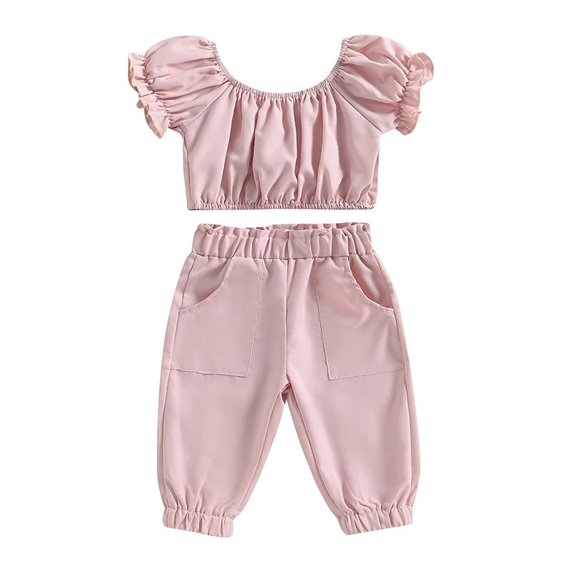 Toddler Baby Girls Summer Clothes Set Solid Color Puff Short Sleeves T-shirt and Stretch Casual Pants