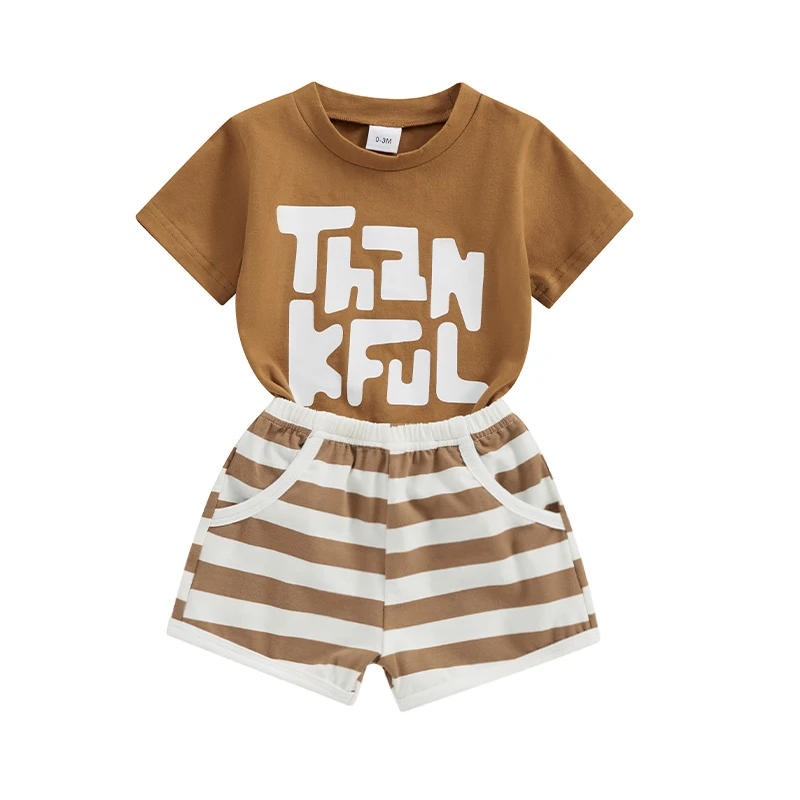 Toddler Boys Summer Outfits Letter Print Short Sleeve T-Shirts Tops and Elastic Waist Stripe Shorts 2Pcs Clothes Set