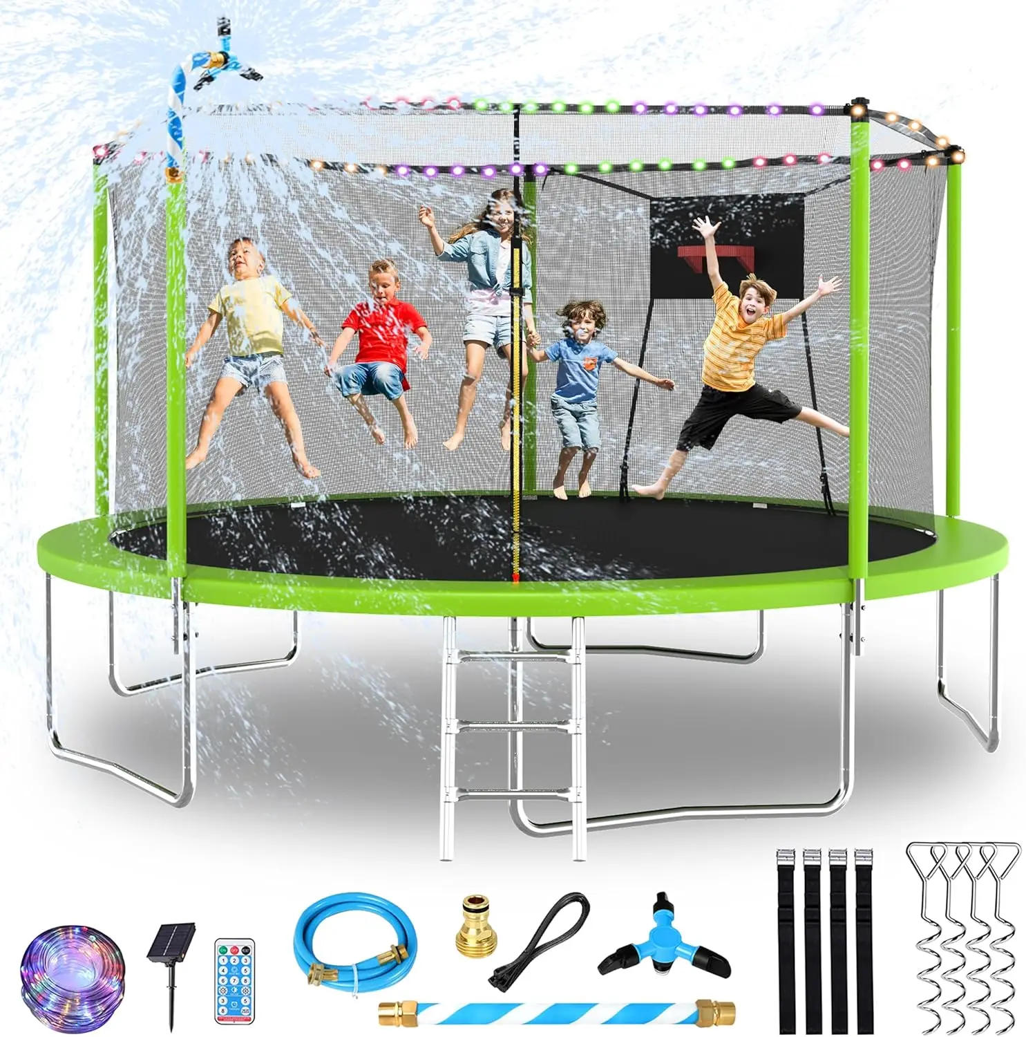 Trampoline for Kids and Adults, Large Outdoor Trampoline with Stakes, Light, Sprinkler, Backyard Trampoline with B