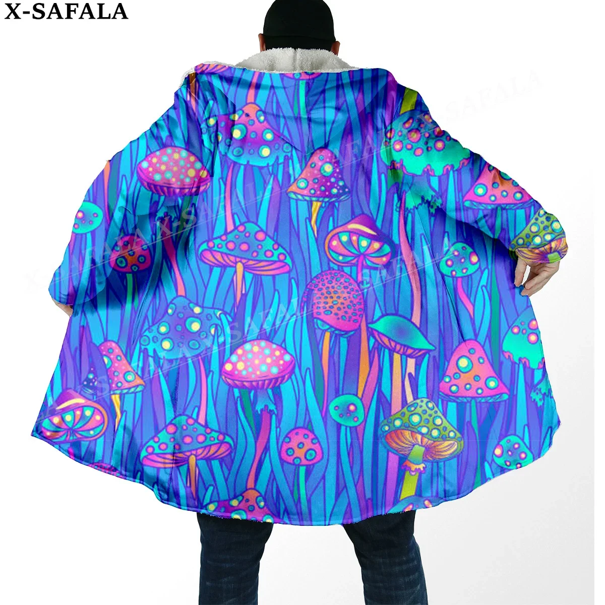 Trippy Psychedelic Mushroom Fungus 3D Print Dream Cloak Thick Warm Hooded Men Overcoat Coat Windproof Fleece Cape Robe Blanket-6