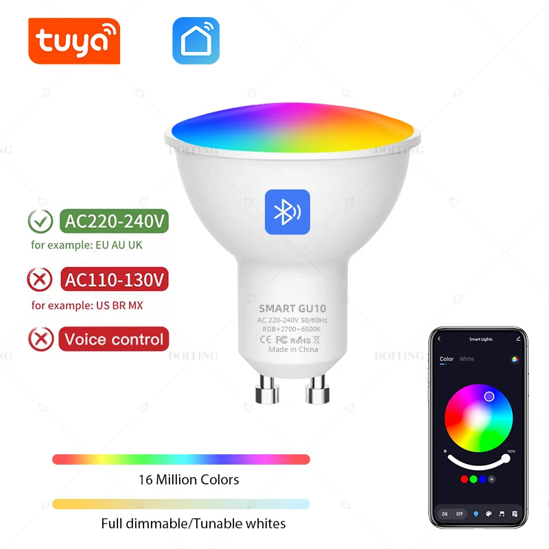Our store&;s LED products persist with foreign strength deviation standards When the rated energy of the lamp isn't greater than 5W, its deviation should not exceed 0 When the rated strength of the lamp is larger than 5W, the deviation should not exceed 10% of the rated cost AC220-240V or AC110-130V narrow voltage LED lights may even have a certain power develop consistent with the increase in voltage For example, the working strength of an analogous AC220-240V slender voltage LED lamp is 4 at 220V voltage and 5W at 230V voltage Our store&;s lighting fixtures are all clever and support brightness adjustment If you feel that the power is simply too high, you may decrease the brightness and gear We aim to produce you with merchandise that meet your expectations Please carefully read the SKU details and product description before purchasing to avoid unnecessary disputes NOTE: Suitable for AC 220-240V voltage, now not AC 110-130V Wattage: Total 5W: White light three + Red gentle zero + Green mild 0 + Blue gentle 0 Total 7W: White mild 4W + Red light 1W + Green gentle 1W + Blue gentle 1W Total 9W: White gentle four + Red mild 1 + Green mild 1 + Blue light 1 Specification: WIFI Version Works with Alexa,Google Home,Bluetooth Version Can not works with Alexa,Google Home Product name: Tuya Smart GU10 Socket Type: GU10 Color temperature: RGB + Warm White + Cold White Voltage: AC 220-240V, not AC 110-130V APP Name:Tuya Smart /Smart Life Features: 1) APP distant control: Tuya Smart APP/Smart Life APP can be used to remotely control the bulb on and off substitute the light color, the brightness 2)Timing: The Lamps is mechanically became on and stale at a given time through the timer operate 3) Share function: Can be shared with kinfolk 4) Colorful: sixteen million colours for you to come to a decision and make your lifestyles colorful Adjust the colour temperature from 2700-6500K, make the sunshine you like 5) Music Sync: The lights brightness can be changed in sync with the beat of your favourite music, creating a stress-free and calm environment Change any room to a dance floor, or create a peaceful and peaceable ambiance Such as living room, kitchen, bed room and so on 6) Group Control: Control all lighting simultaneously through creating teams and including your lighting to your group