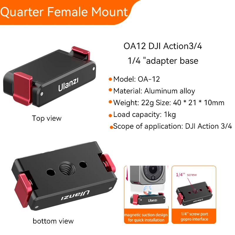 Currently, MT-50 has been updated to the latest version and solely supports DJI Action 3 and Action 4 Magnetic Connection as DJI System Adopts Action 3&;s revolutionary magnetic design, whatever Camera Module, Power module or front Touchscreen Module, which can soon mount at the tripod Magnetic Connection as DJI System Adopts Action 3s revolutionary magnetic designno subject Camera Module Power Module or Front Touch display screen Module , which might soon mount on the tripod Lightweight for Lightweight Hold in a single hand , lightweight and portable works completely watch-sized for DJI Action three , recording on the go freely Sports Scenes, Waterproof and Dust-proof ABS resin + aluminum alloy materials , waterproof and dust-proof equipped with DJI Actions up to the sky and right down to the sea easy to address any sports activities capturing scenes How To Use Work as extendable pole compatible for selfie or trod stand shooting, meets various desires Three-stage Expansion Ball Head Metal ball head, 360° taking pictures angle, offer extra creation Details 1 handle: Non-slip texture, completely satisfied grip 2 Tripod Lock: No misplace when opened, extra tightly when closed three silicone pad: Stable stand, no slipping four Silicone handle: s-shape ergonomic design, extra labor-saving DJI Action3 Magnetic Quick Release Ball Head Magnetic Connection as DJI System Adopts Action three modern magnetic design, no matter Camera Module, Power Module or Front Touchscreen Module which might quickly mount on the tripod The identical magnetic design works perfectly Damping Design for Cold Shoe Mount Able to mount video light, mic or different equipment ;Easy to regulate angle via rotating the damping Universal 1/4 " Screw Port Built-in 1/4 " screw Poort on the bottom, able to connect tripods selfie sticks, mild stands and different kit Support Horizontal and Vertical Shooting 2 U-shaped slots for Horizontal / Vertical / Side Adjustment, Set Your Camera at Any Angle DJI Action 3 Magnetic Quick Release Small Head Magnetic Connection as DJI system Adopts Action 3 innovative magnetic design, no matter Camera Module, Power Module or Front Touchscreen Module which may soon mount on the tripod The identical magnetic design works completely Dual Base for Multiple Use Magnetic base: Adsorb on iron floor 3M Adhesive mount: Stick to any flat surface equivalent to glass and tile Support Horizontal and Vertical Shooting 2 U-shaped slots for Horizontal / Vertical Side Adjustment, Set Your Camera at Any Angle Metal Material Lightweight and Durable Made of aluminum alloy, rust-proof and drop-proof Only 38g, easy to list on the go Magnetic Base Mount 1/4 Female Mount