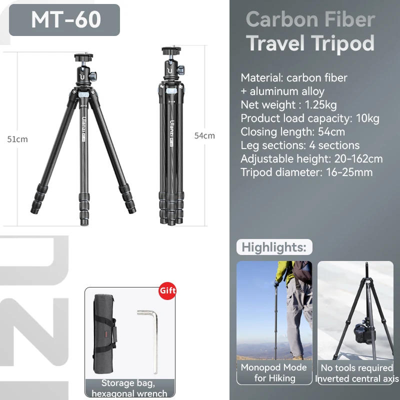 180° Foldable Design Save Storage Space Reverse-fold portable design, more handy for out of doors Screw Locking System Screw it clockwise to lock ,screw it counter clockwise to open, quick adjustment Can Rise to at least one With the Center Column Monopod Mode for Hiking Quick disassembly swap between assorted kinds for multi-use Center Column for Overhead Shooting Easy to get a low-angle shooting by way of the central column 360° Panoramic Head Independent locking knob precisely control the capturing view Load-bearing Hooks for Hanging Backpacks Increase the soundness in windy and other particular climate 28mm wide tube diameter Carbon fiber legs four section design 1/4 inch screw hole: Able to connect magicarm to attach moreexternal instruments 2 Arca quickrelease plateApplicable to a varietyof models, easy todisassemble and install three Leveler design: Adjust the level of the tripod by means of the bubble 4 Sponge glove: Make the handheld feel more well-off five bag Fashionable and portable for out of doors taking pictures Parameters Model: MT-61 Material: carbon fiber+ aluminum alloy Ball head load capacity: 3-5kg Tripod load capacity: ≤15kg Storage size differ : 47± 1cm Stretch length range : 171 ± 3cm Tripod leg sections : 4 sections Tripod tube diameter : 19-28mm Product weight : 1± 0 Product kit size : 13 * 13 * 55cm