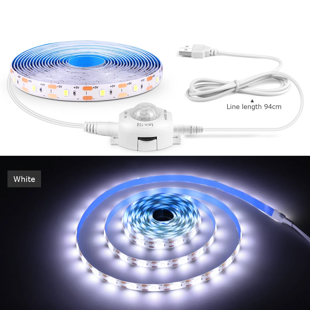 Sensor ONLY paintings at Dark ! (Night)NOTE: The movement sensor led strip solely work at night or darkish environment. Specifications: Type: USB 5V LED Strip With PIR Motion Sensor Light Color: White / Warm White SMD Type: 2835SMD Color Temperation: White (6000k-6500K); Warm White( 2800K-3200K) Sensing Distance: 1m - 3m Time-Delay:30s-10min (adjustable) LED Strip Length: 1M 2M 3M LEDs QTY: 60leds/M Waterproof Grade: IP65 water-resistant Application: corridor, bedroom, dwelling room, bedroom, stairs, kitchen, closet, wardrobe, cabinet, hallway Packaging: 1 x LED Strip Lights 1 x PIR Motion Sensor Controller